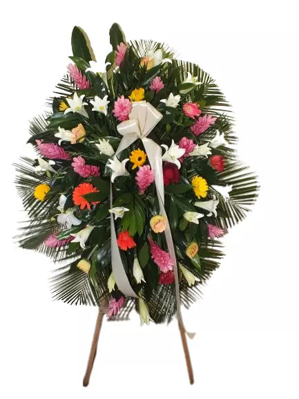 Despide a ese ser querido que ya no se encuentra con nosotros con el Ramo de pie fúnebre elaborado con flores exóticas y diseñado con ginger, gerberas, lirios y/o anturios.