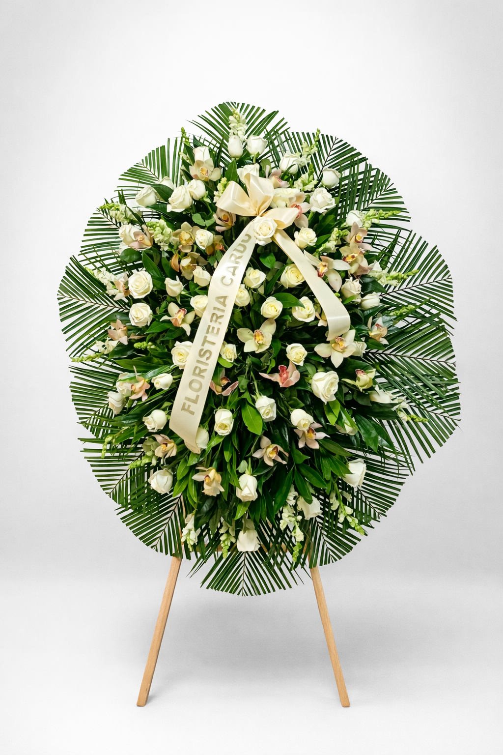 Expresa tus condolencias con el ramo de pie fúnebre, elaborado con rosas, cymbidium y follaje.